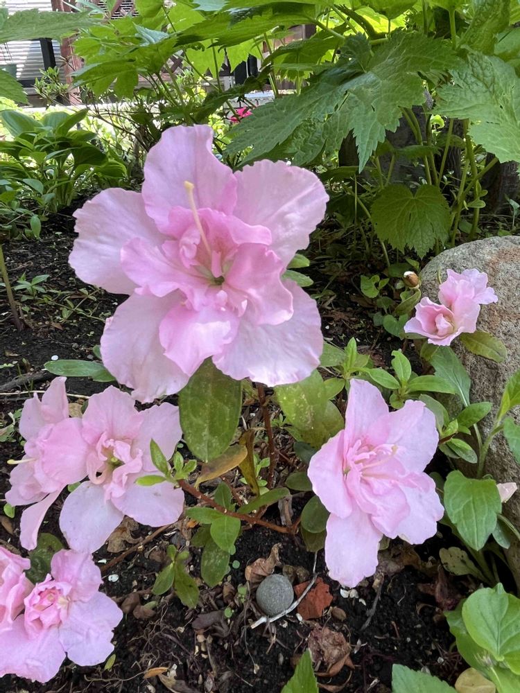 和風の庭と呼んでいるスペースにアザレアの八重が咲きました 置いた石の側で落ち着いて咲いてます ②先に咲いたピンクのアザレアも奥の方で咲いてます ③ 去年造った和風もどきの好きなスペース ④ 2階から見下ろした木々は葉っぱが茂って木陰を作ってます