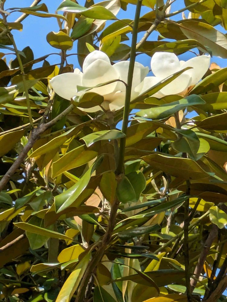 ①この頃良く掲載されているホウノキなら良いなあと思いましたが、この花はタイサンボクですね。葉が細めです。花の顔が見えるのにまた出逢いたいです。