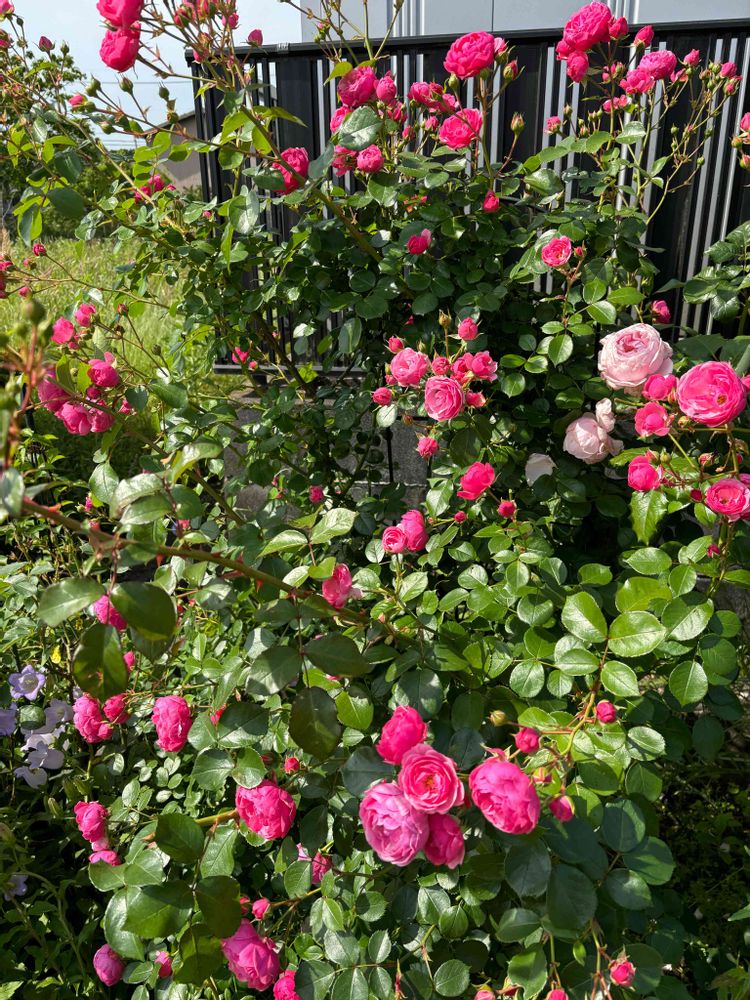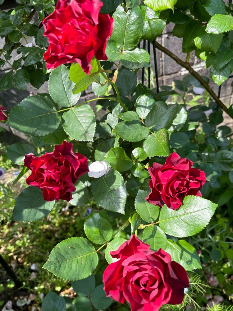 真紅の薔薇オマージュバルバラ咲きました 今年はポンポネッラの花付きが良くこれから満開です😊