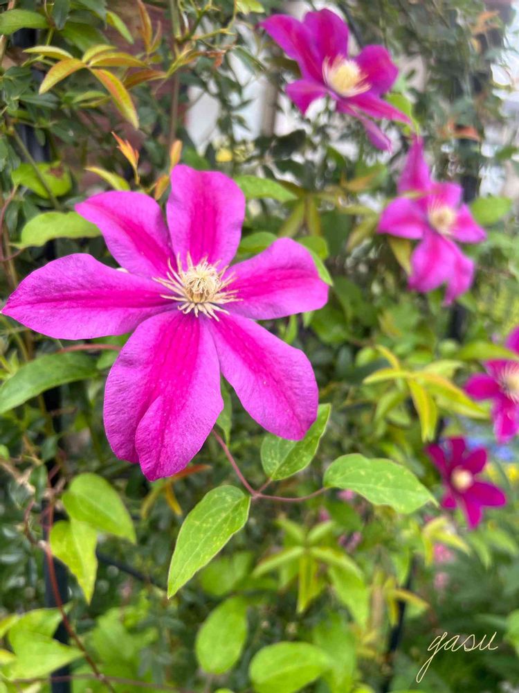 ジャックマニー系の新旧両枝咲きなので例年そこそこの剪定でしたが、今年はバッサリいったのが良かったみたいで蔓が旺盛に伸びてます🎶
