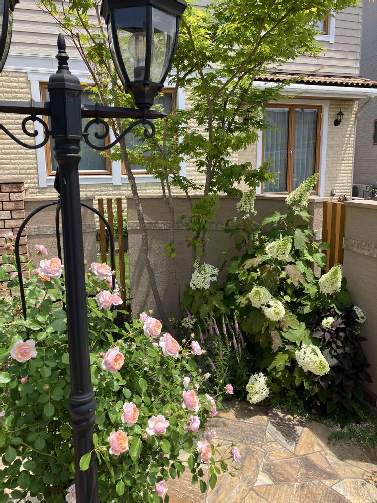 こんにちは🌿バラとアジサイのコラボ💕遅咲きだからかな🤗エリザベススチュアートです💓カシワバアジサイも派手ではないけど、おおきくて華やかですね🌿✨