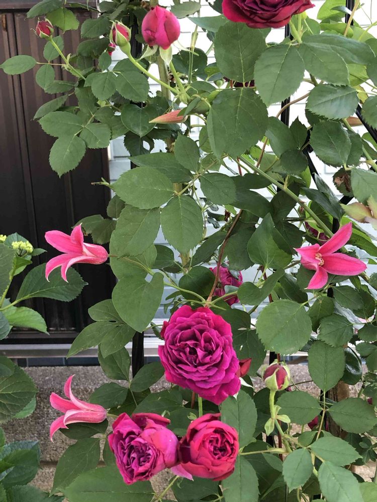 2枚目のpicだけでは分かりにくいのですが、ジャメイン先生の薔薇は咲き進むと紫色になって行くので、若い花とのグラデーションが素敵です。そこに濃い紫のクレマチスが入ると更に素敵になるかなぁと思っています。