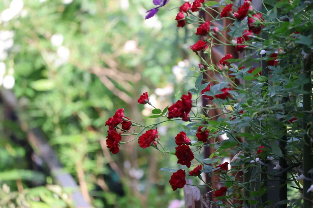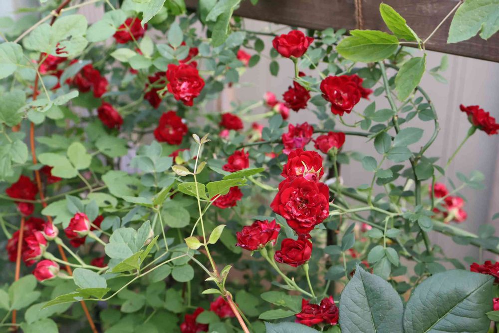 去年かなぁ〜誰かに😅いただいたレッドキャスケード🌹可愛く咲いたけれど、この子ツル扱いでいいの⁉️ どのくらい伸びますか〜⁉️
