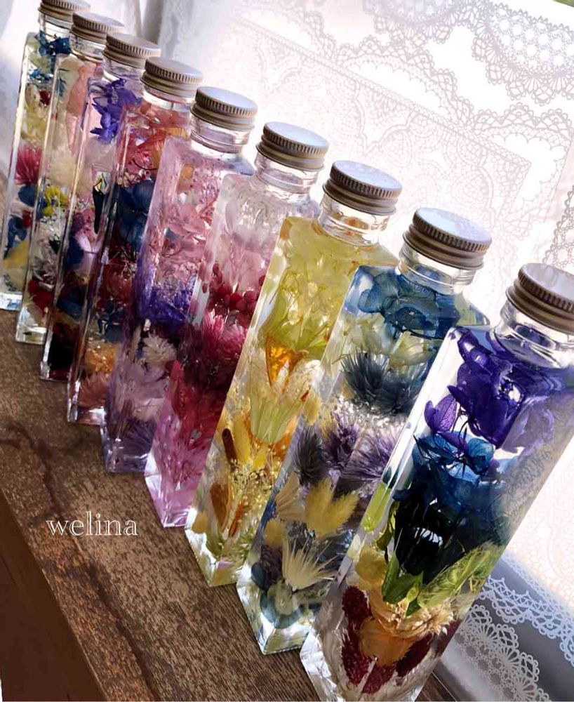 @welinaさん、こんばんは。今かな?ハーバリウムがあちこちで見かけるようになりましたね。オイルにつけてあるカラフルちゃん。作るの難しいのでしょう?でもお花から作ったているから、自分の育てた花で作るのは、愛着が違いますよね。チリン🎐チリン~🎵🎐チリン~🎵🎐