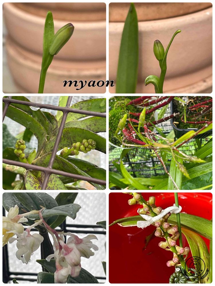 トキソウ、バンダ プチブーケ、竹葉セッコク、デンドロビウム アベランス、エリデス ロゼアの蕾たち
