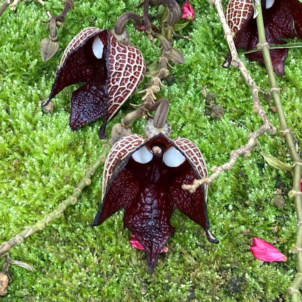 説明文より〜ウマノスズクサ料の植物。原産地はエルサルバドルで、名前の由来となっている。常緑のつる性低木で、地際付近から伸びる細い花美に花をつけます。花は直径約4cmで、萼筒の中心付近にある2つの白い模様は、昆虫を誘き寄せるための目印とも言われています。