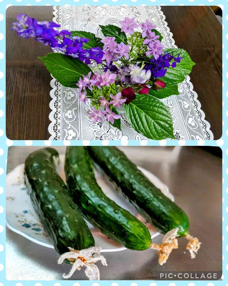 我が家の花紫陽花と、主人の畑から今朝、花付き(ドライフラワー?)の、キュウリ🥒を収穫して来てくれました🌟✨✨✨