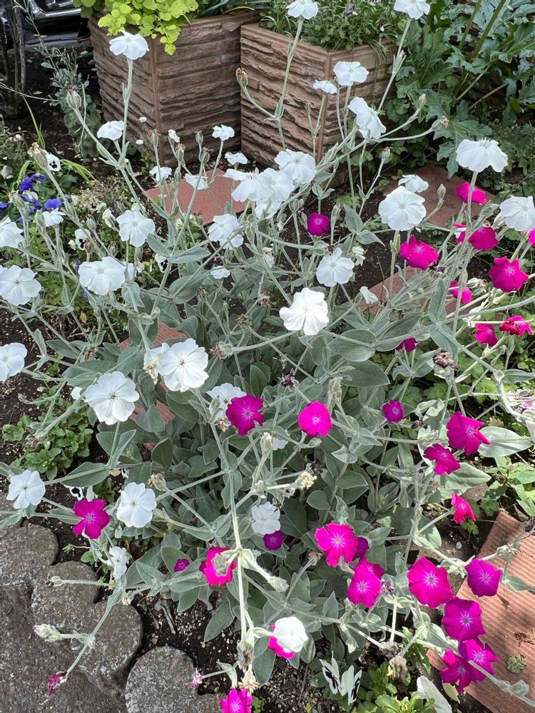 スイセンノウも葉っぱがモフモフして鮮やかなピンクが可愛らしいけど、白と一緒に咲いていると、更に可愛いですね🩷🤍