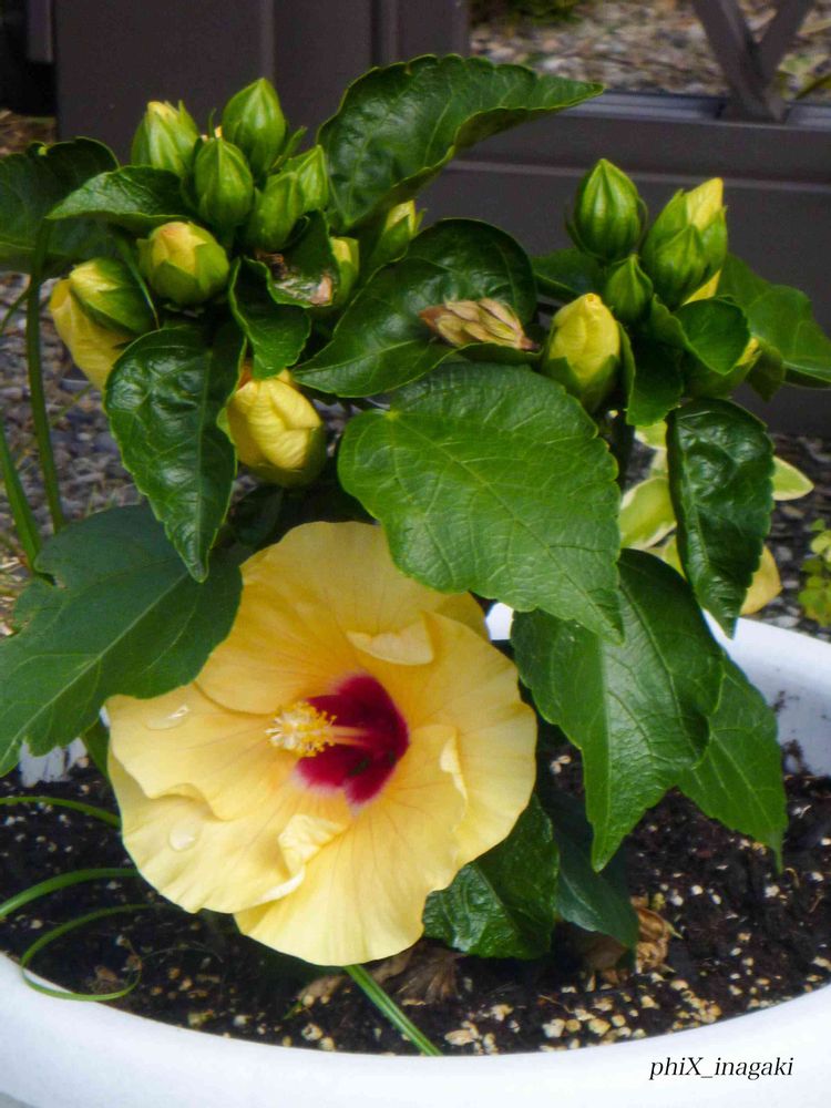 黄色いムクゲもあるんですね。訪問先の街は,全体がGSジェニックです。あるお宅の玄関先に鉢植えの黄色い花が咲いています。葉っぱの形から,ムクゲと思いますが,黄色いのもあるんですね。
