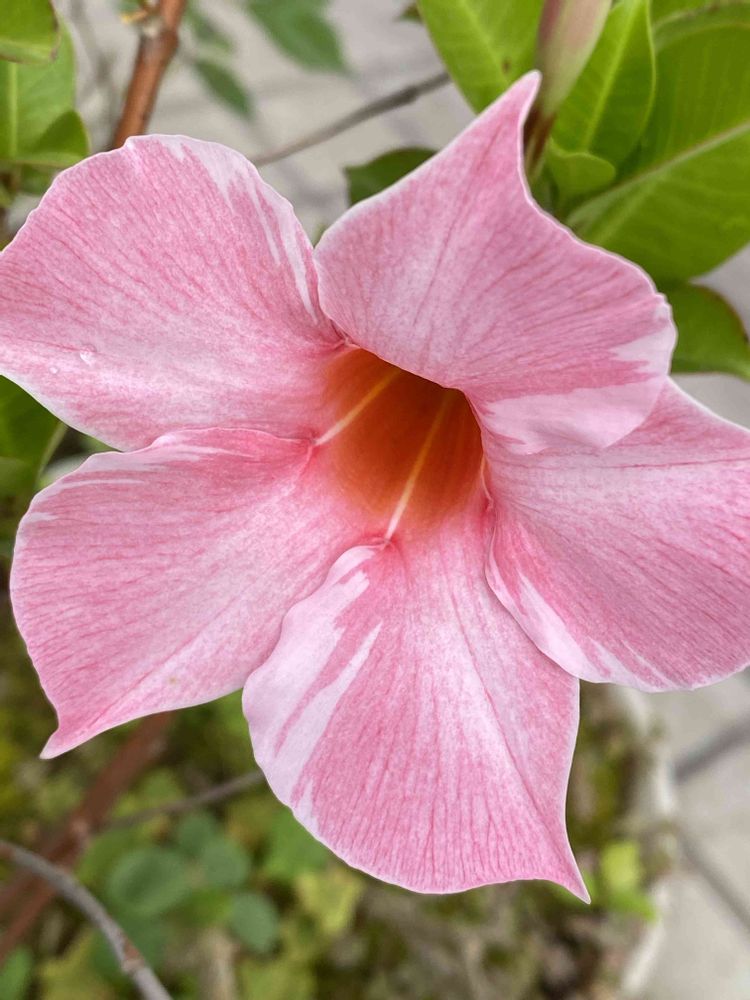 ☘️ディプラデニア[ファッションローズ ]☘️....別名マンデビラ。冬に戸外に出したまま雪もかぶったのに見事に復活したよ、嬉しいな😍👍✨日照不足では休眠してお花が咲かなかったり葉が黄色くなったりするそうだから、いつでも陽当たりに置いています💕✨