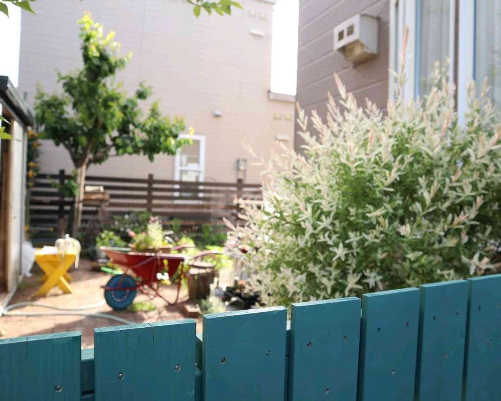 みどりの塀?ドアーに赤の3輪車黄色の椅子😁👍