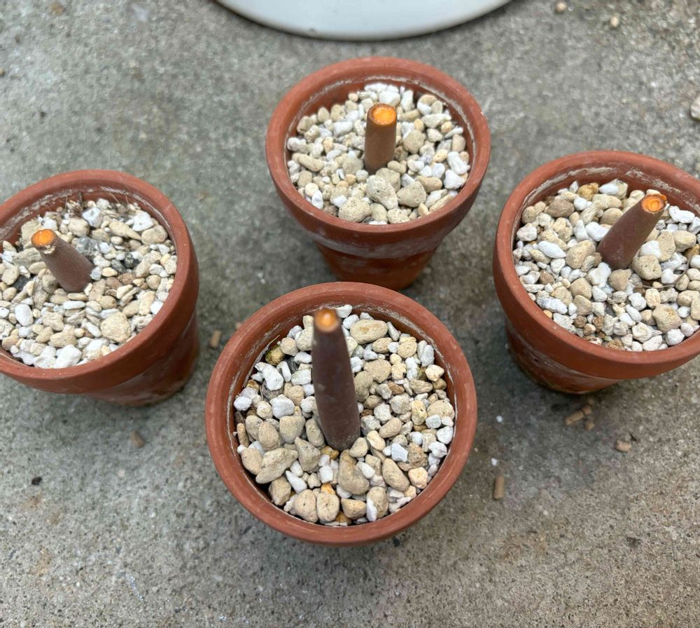 三枚目は去年播種したアデニウムアラビカム、一向に葉が出ないのでスパッとカッターで剪定。