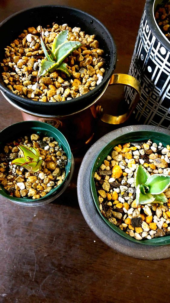 スカブラ錦お迎え子株、株は小さい割に根っ子は地上部の2倍くらいの綺麗な白い根出てたので期待も込めて一回り大きな鉢に🌝