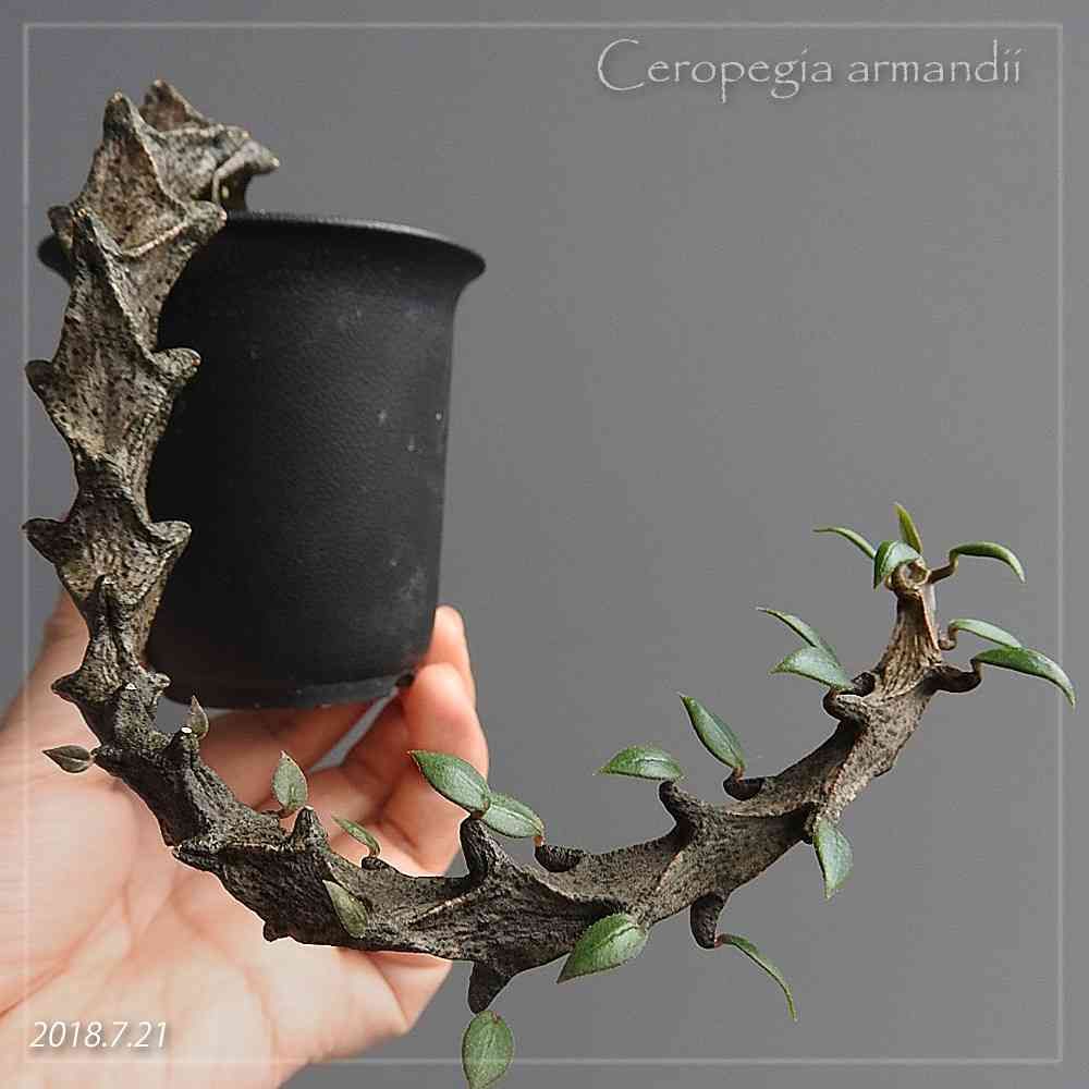 セロペギア、アルマンディ。危険レベルの猛暑続きだけど、コイツにとってはうれしいみたい。10日前(http://greensnap.jp/post/2674803)よりさらに伸びています。定期的に写真を撮って見てみると週に一節くらいの割合で伸びているみたい。水と肥料をやり始めたら、節も大きくなりました。