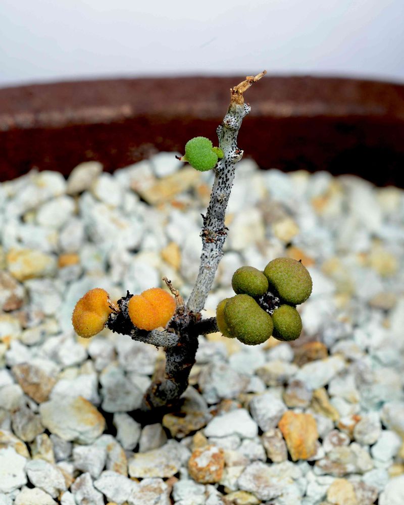 南アフリカ出身のチレコドン・ボドレイアエです。冬型なので本来は葉を落としている時期なのですが、この猛暑に関わらず元気いっぱいです。新葉を展開していたり、旧い葉は紅葉していたり、で葉っぱが色とりどりになっています。