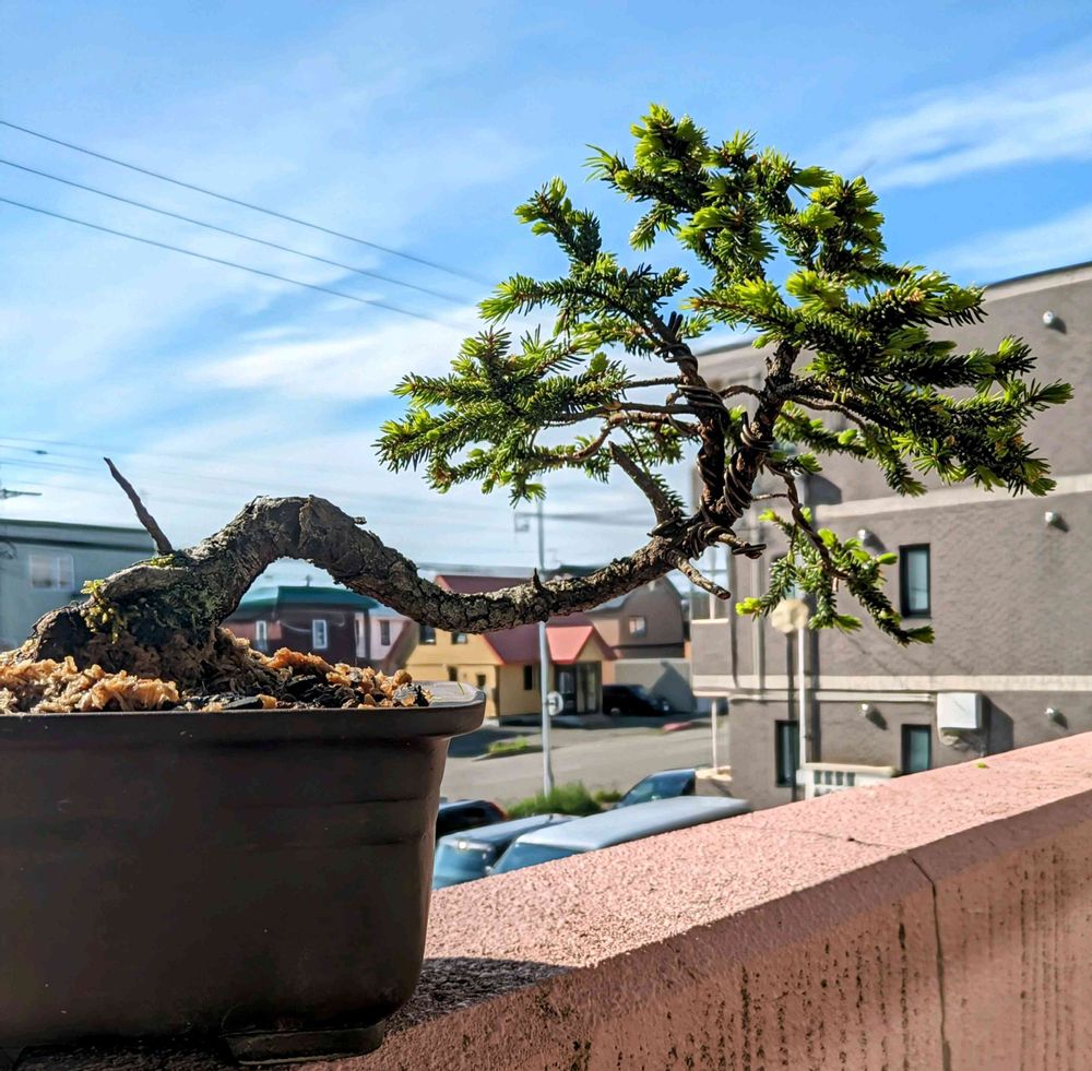 エゾマツの芽摘みをしました。GWに植替えをしましたが、拗ねることなく生育しています。流れが変則な樹形ですが、下からの姿が格好よい。枝を下げたい場所もあるけど、焦らず枝振りは作ろうと思います😊