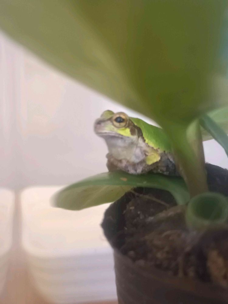 最近、仲間入りしたアマガエルです。名前はまだ決めていませんが、マイケルとこの子もよろしくおねがいします。