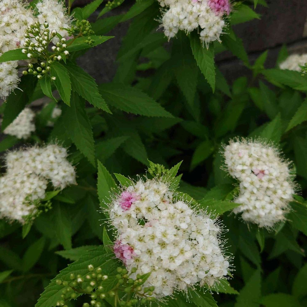 シモツケソウ開花の時期ですね💕白にピンクが入るのは珍しいですね👀毎年入るのかな?我が家はピンクが開花中❗️日陰で肥料もあげてないのに沢山咲いてくれて表に移動してリキダスをあげたところです!