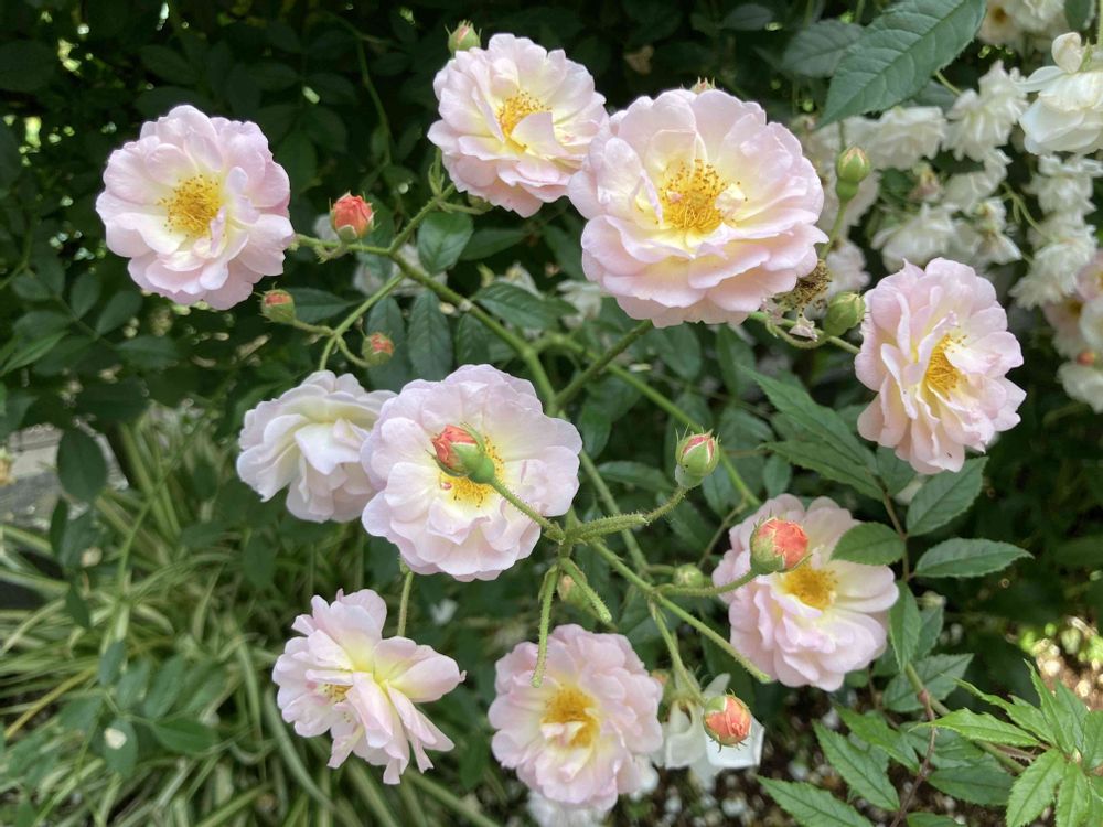 さん こんにちは😊 アプリコットからクリーム色への変化があるので一番の花盛りの時期は混植のような感じで溢れるように咲きます。儚いので次々にカットをしながらでないとすぐに全体が汚れた感じになってしまうのが玉に瑕😅でもとっても可愛いバラですよ🧡💛