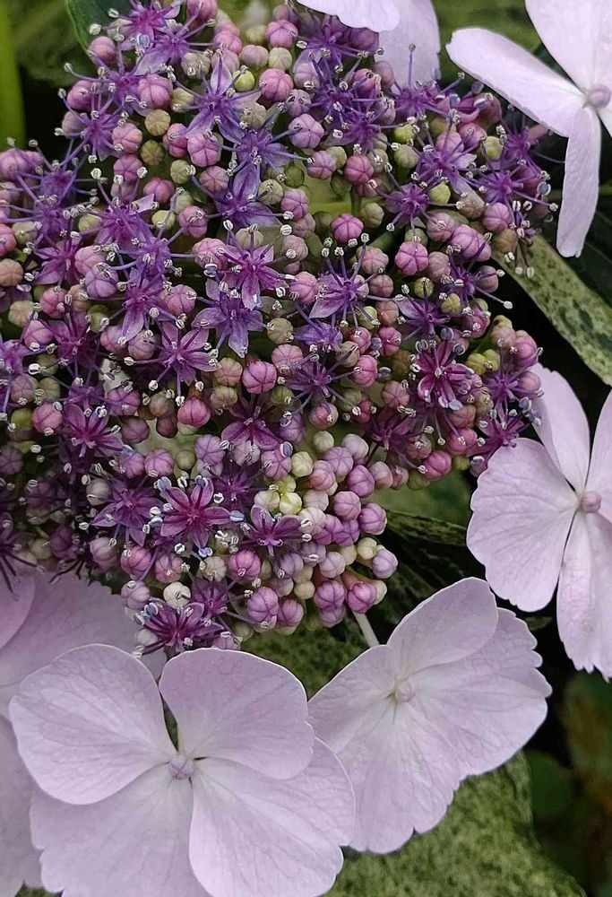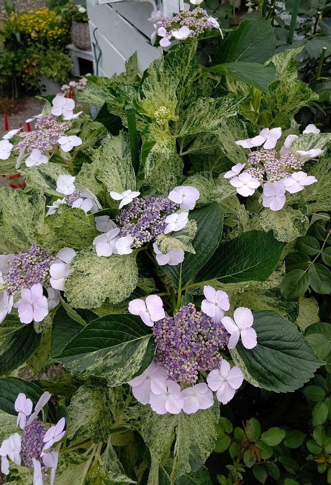 初めて咲きました。斑入りの葉っぱを楽しむ紫陽花で こんなお花だと知らなかったです😅紫陽花も いろんな種類がありますね~😲