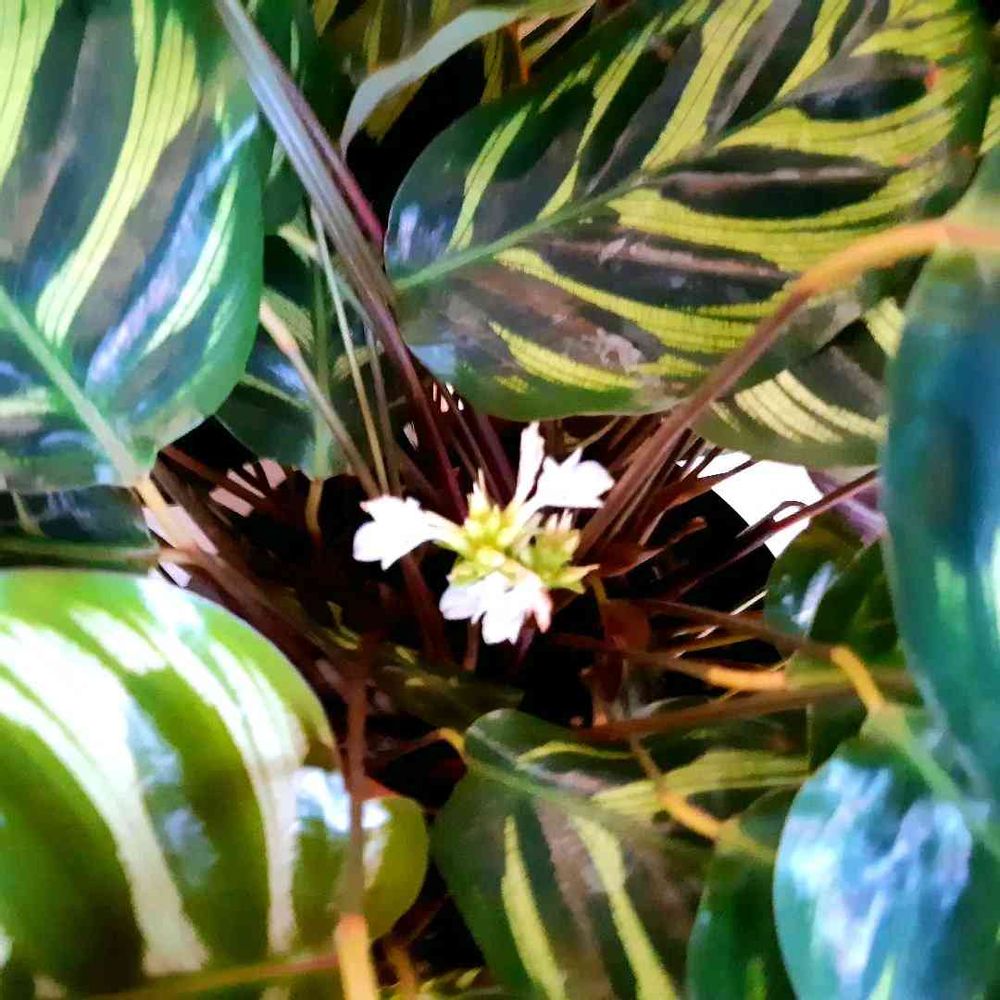 観葉植物の苗で買って、もう5~6年になるカラテア マコヤナ、大株に育って、葉っぱをかき分けると👀なんと!花が咲いてる✨