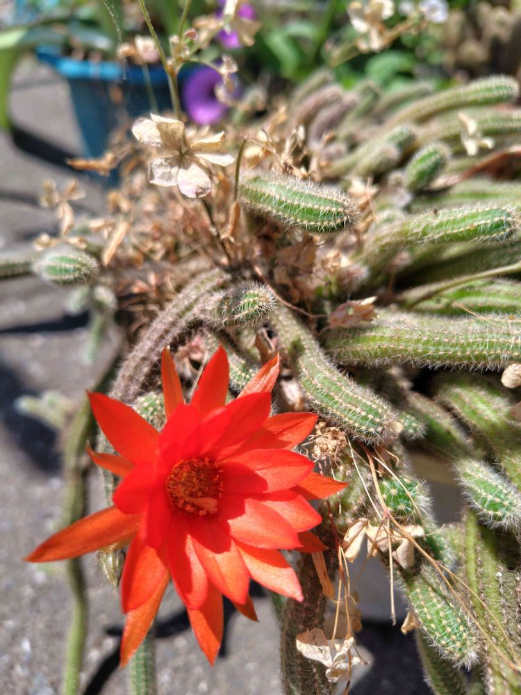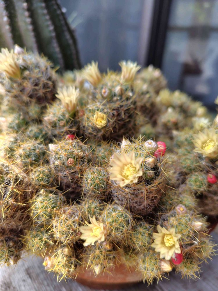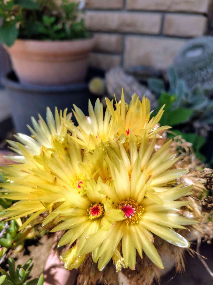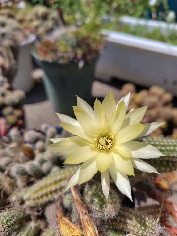 うちのじゃありませんが…ご近所の〜サボテンが虫干しみたいに沢山出してあって、色々なお花が咲いていたので写真を撮らせてもらいました。