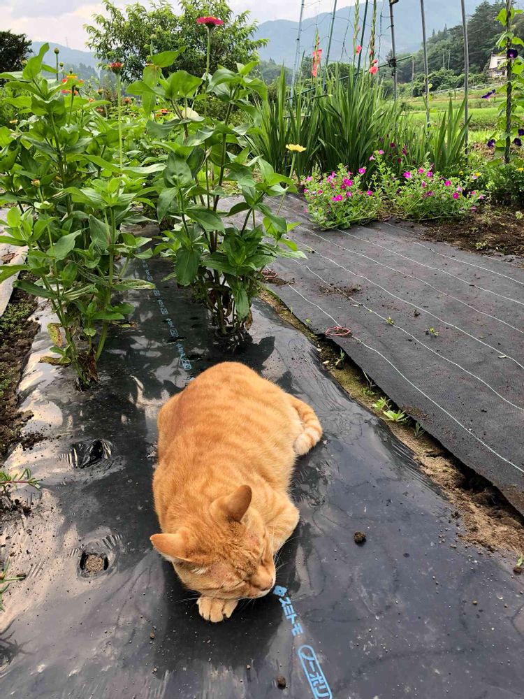 朝の草取りについて来たんだけど、眠くなっちまった😪