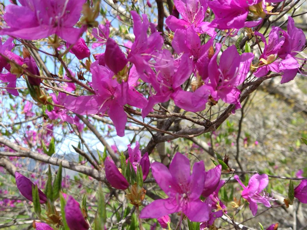 ①天空で鮮やかに咲くトウゴクミツバツツジ