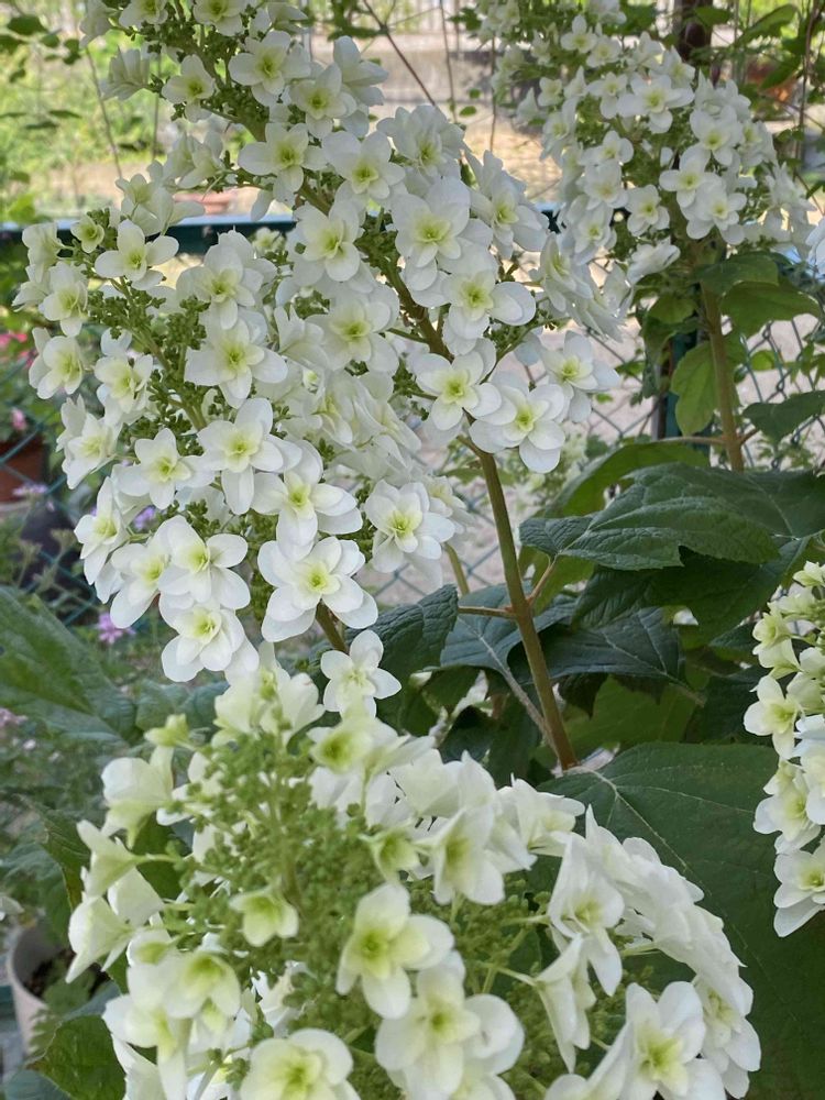 挿し木から育てて、もう10年余りの柏葉紫陽花です。今年は22個の花がつきました。鉢植えなので、花の時期は朝夕に水やりしています。