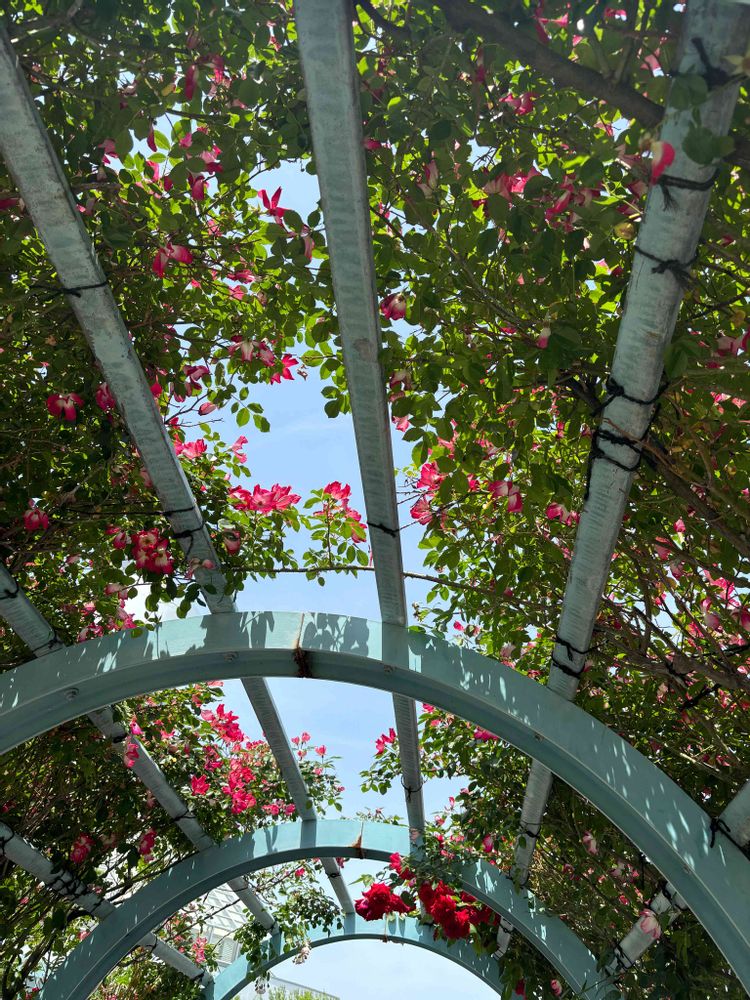 青空を背景にした、トンネルから眺める、つたが絡まるバラ🌹の楽園風景素敵だなぁ🎵✌️