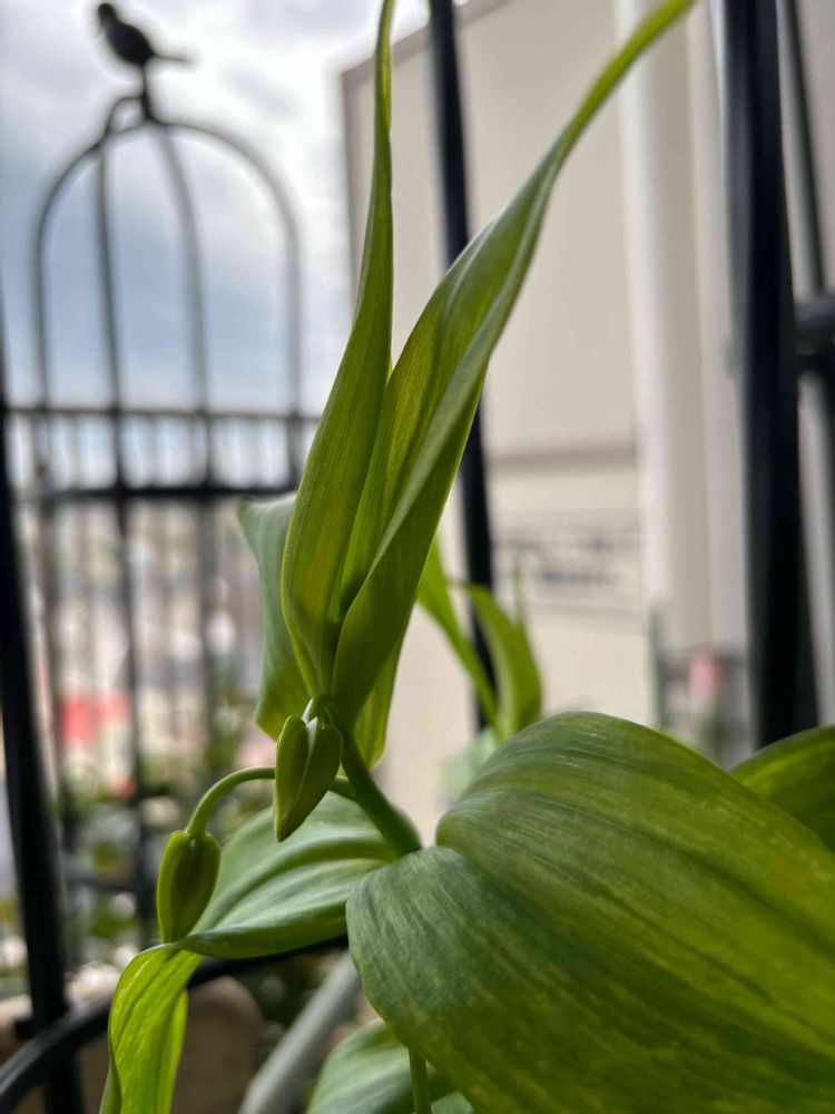 花友さんからいただいたグロリオサの球根から芽が出てからもう85cmにも伸びました!小さな蕾は5つも付いています!😄