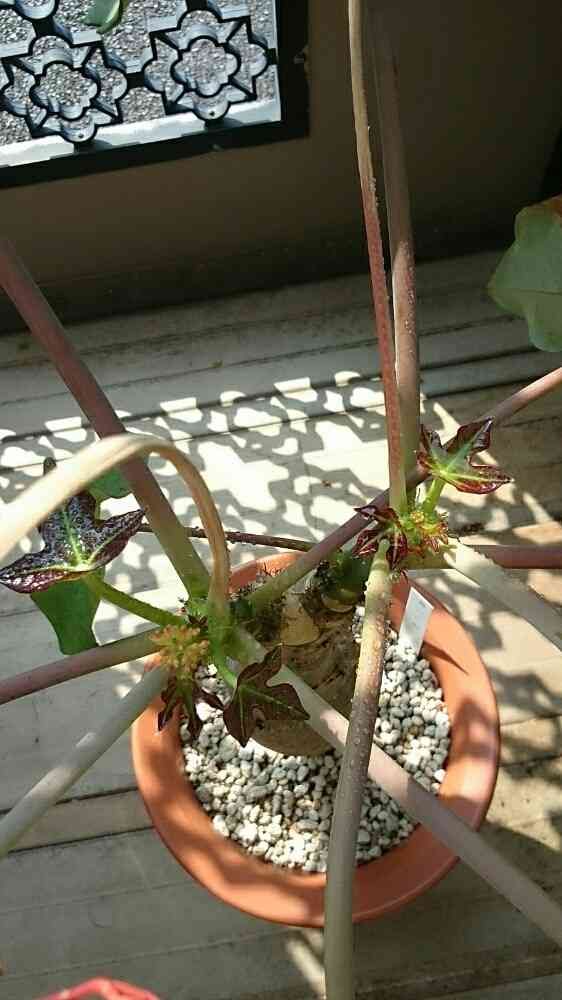 サンゴアブラギリに新しい葉っぱとお花が出てきました