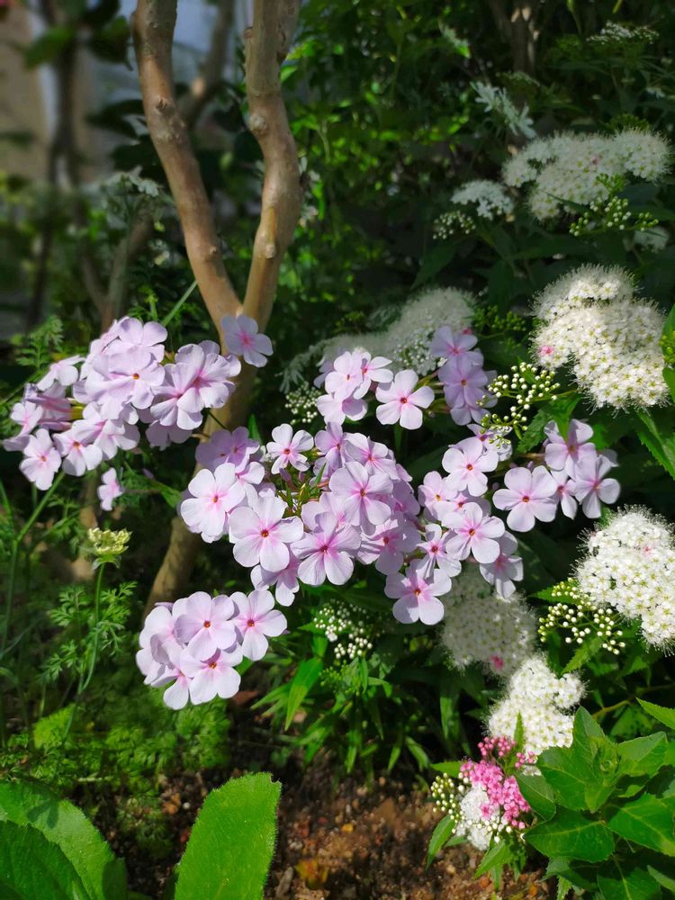 ①低木のシモツケが咲き始め、フロックスの優しいピンクによく合います💖