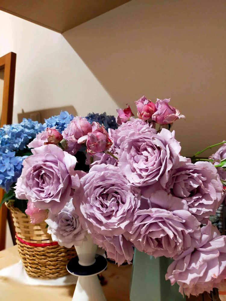 ③カットしたノヴァーリスは玄関で楽しんでいます☺ぜいたくな花束です💖一輪、ブルーグラビティが混ざっています。わかるかな❓
