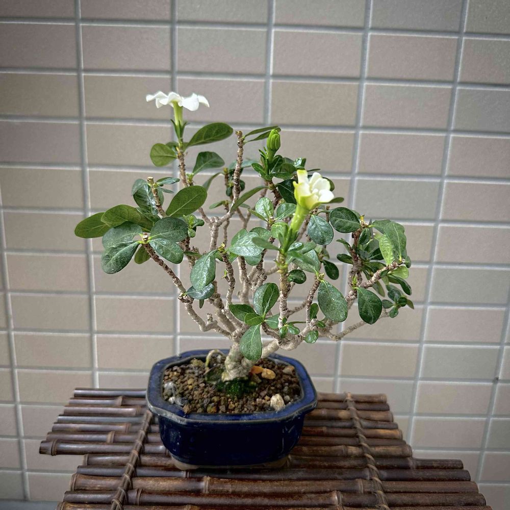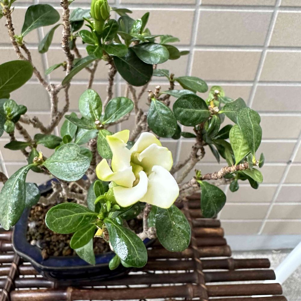 「丸葉梔子」が今年も開花しました。昨年は2輪、今年は今2輪でツボミ一つ計3輪です。✨いい香り✨