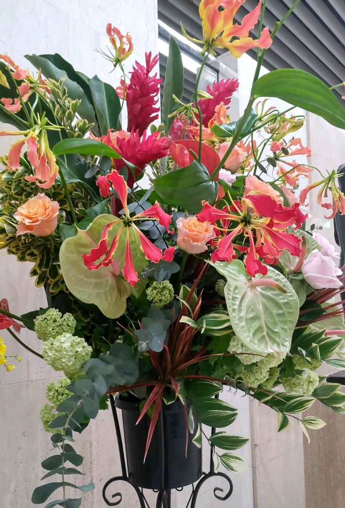 今日の花グズマニア❤️後ろ中央に、チャリテーショーの祝い花綺麗💚❤️