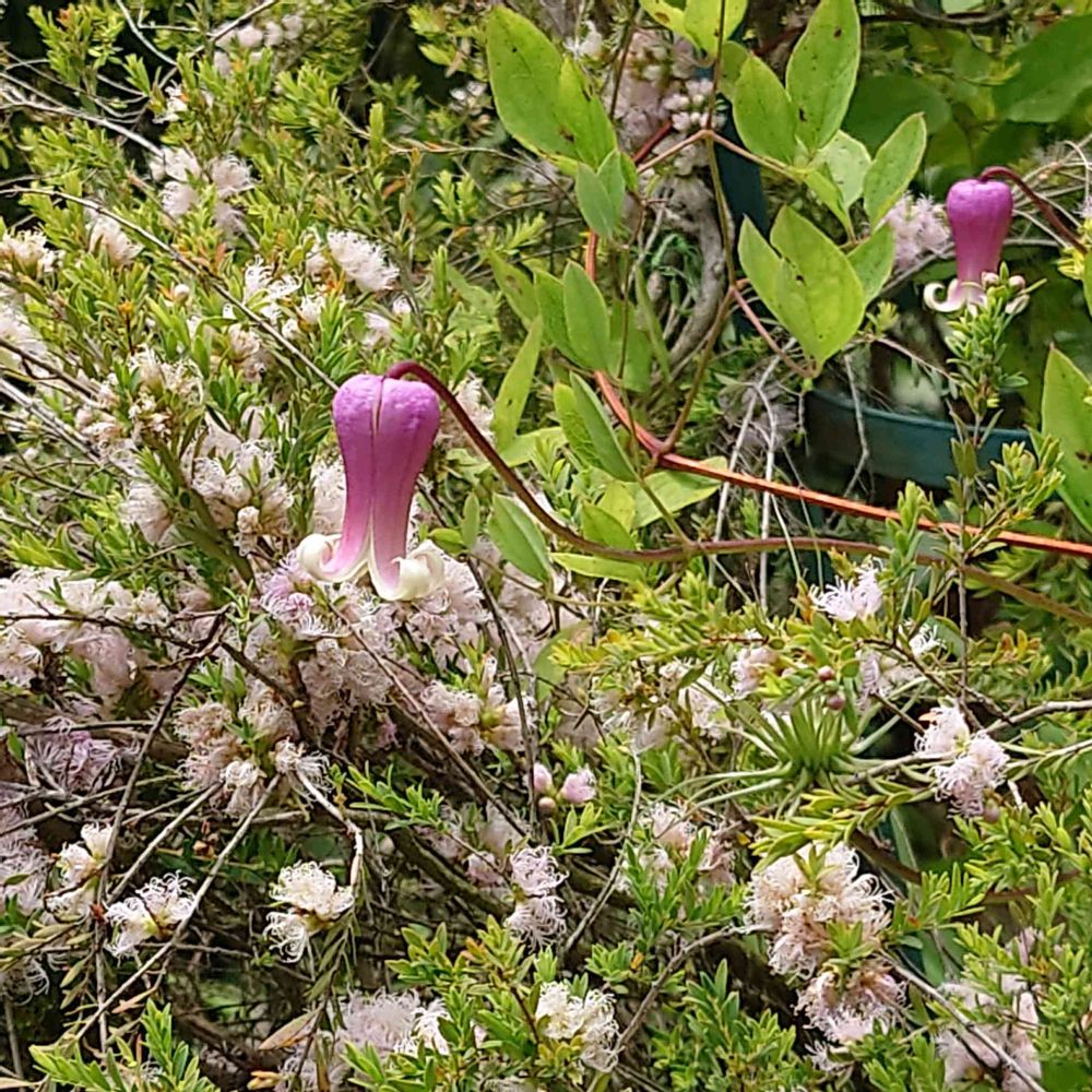 今日は壺型のクレマチスでちょっとお揃いかと思ったら、メラレウカにスポットをあててあるんですね。🤍🌿