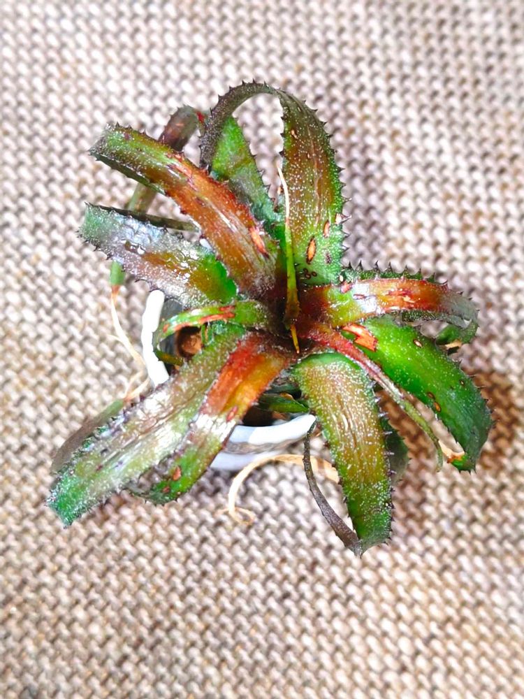迎えた時は濃いグリーンと真っ赤な新芽でインパクト大な姿だったけど、一時は緑のみになり葉先が枯れ始め、最近はやっと緑がもどって気温のせいか赤みが復活し始めた😁