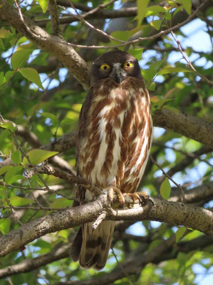 ①アオバズク:初めての出会い。調べたらアオバズク(フクロウ科アオバズク属)と判明。大きな目と身体の縞模様が特徴で、体長約30cm。近づいてもじっとしていて可愛かったです。