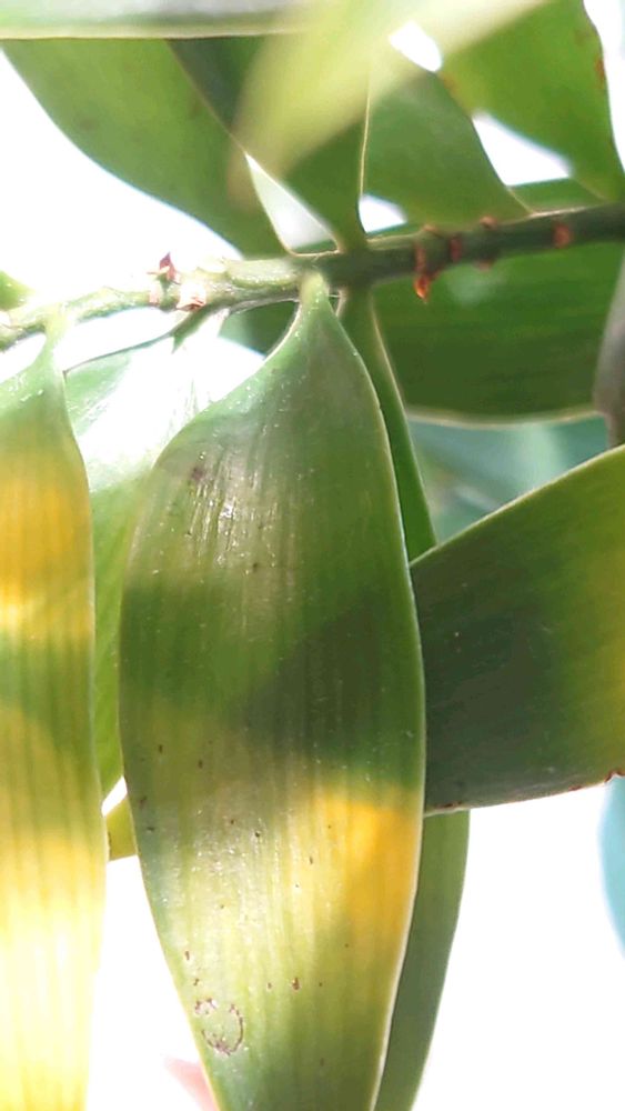 葉が黄色くなってきたナギの木。お水をあげていたら、葉が1枚落ちた。どうも様子がおかしいとじっくり見ていたら、黄色くなった葉のある枝の付け根付近の葉がこのような状態に。