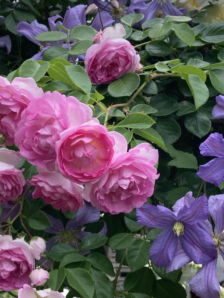 バラの名前は聞き忘れてしまいましたが、クレマチスは*プリンス・チャールズ*です。