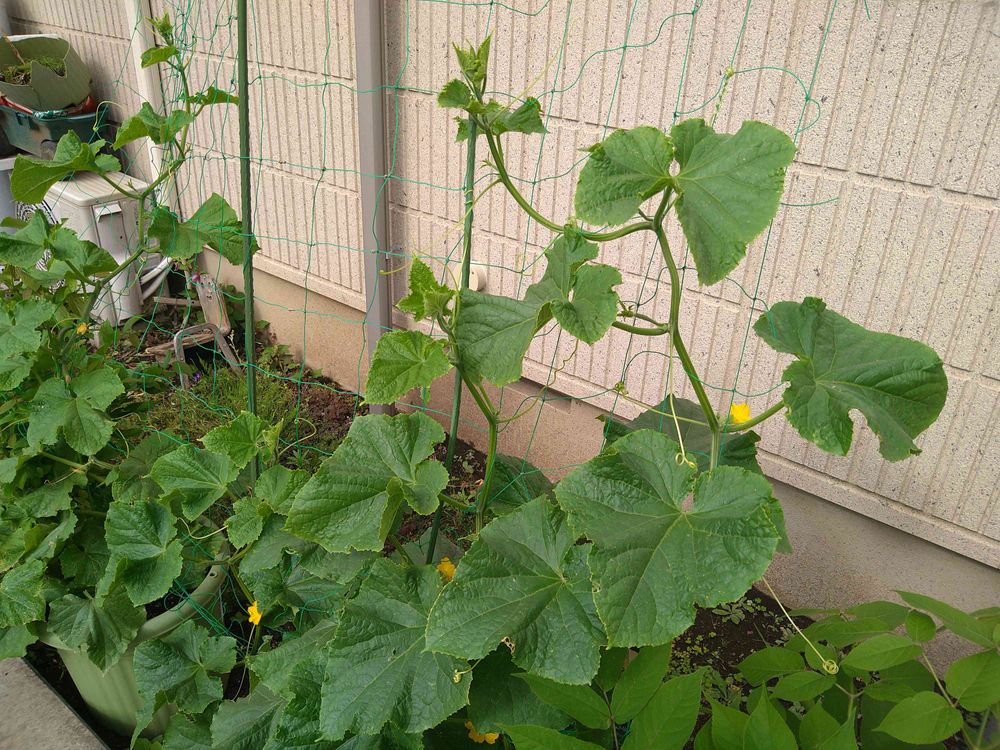 夏の家庭菜園の季節です🥒大分良い感じになりました。昨夜の風で茎の折れを心配しましたが無事だったので良かったです。支柱は大事!