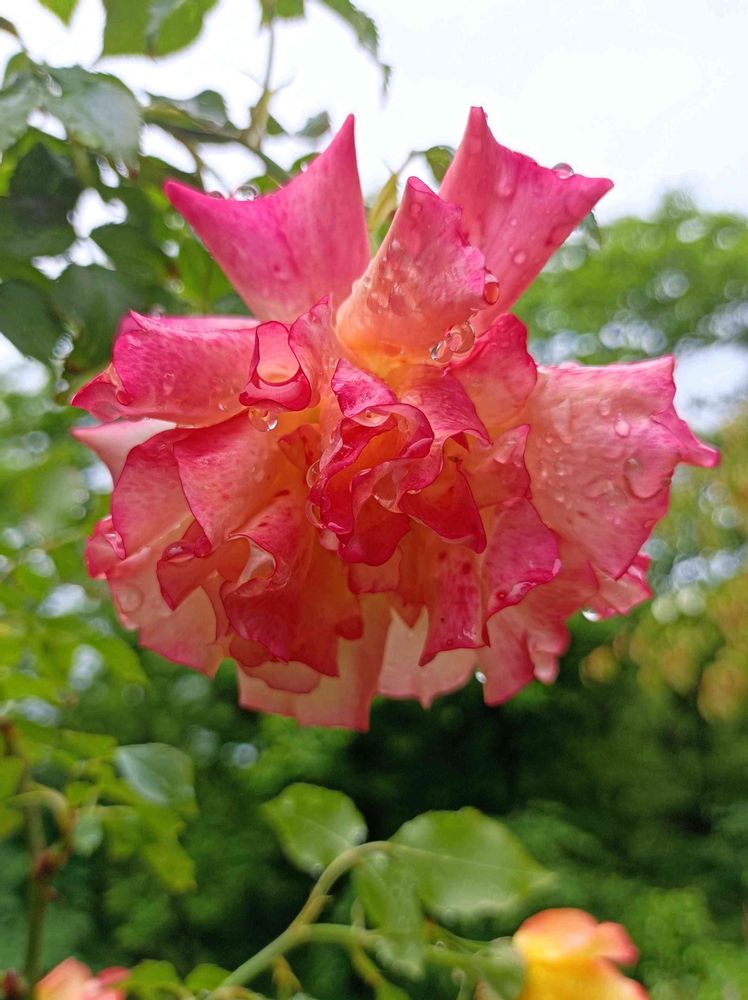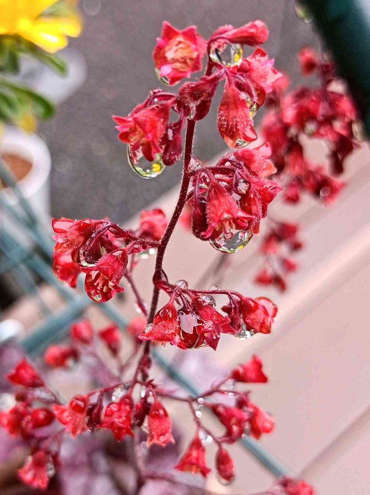 雨上がり、雫💧をまとったヒューケラの花、バラ、どれも綺麗ですねー😍