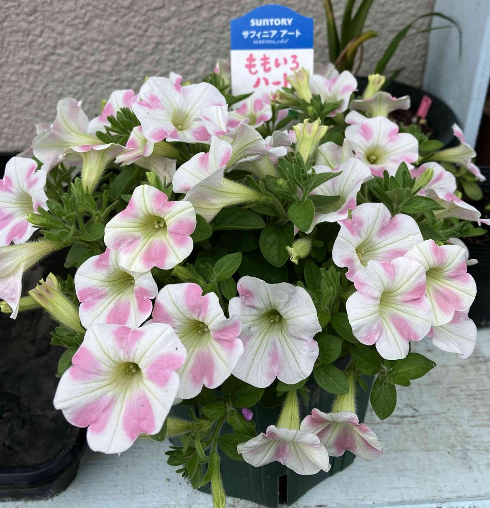 サントリーフラワーズさんのサフィニア・アート、ももいろハートが8号鉢でモリモリになりました。