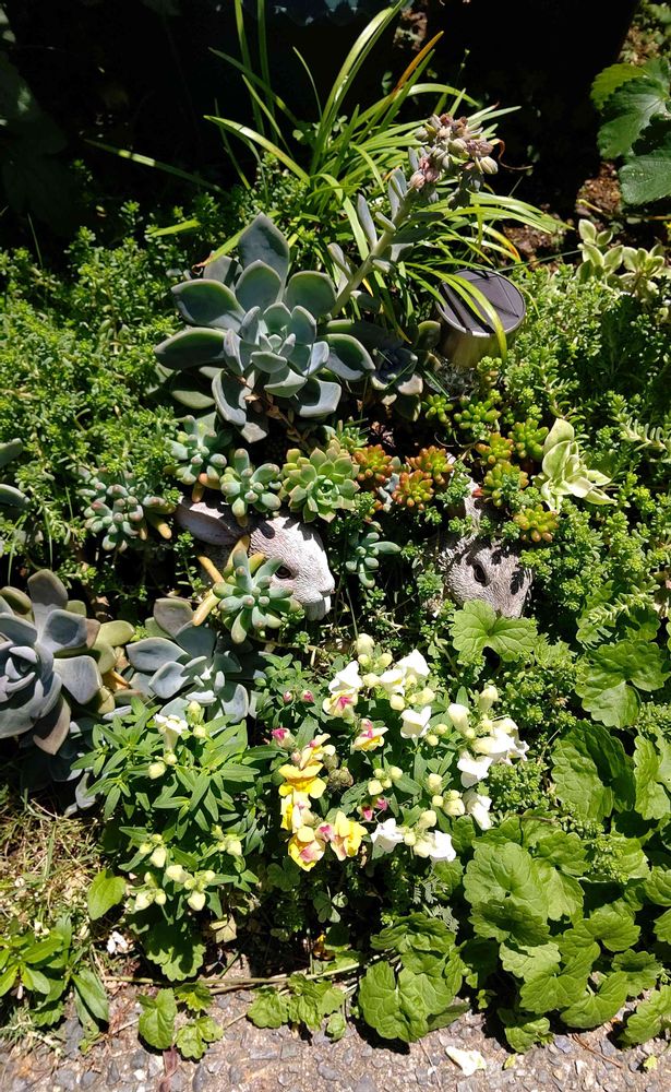 ②地植えの多肉ちゃんの周りに いろんな植物が 勝手に生えてしまってます。どれか一つ抜くと他のも抜けてしまうから 触れません💦