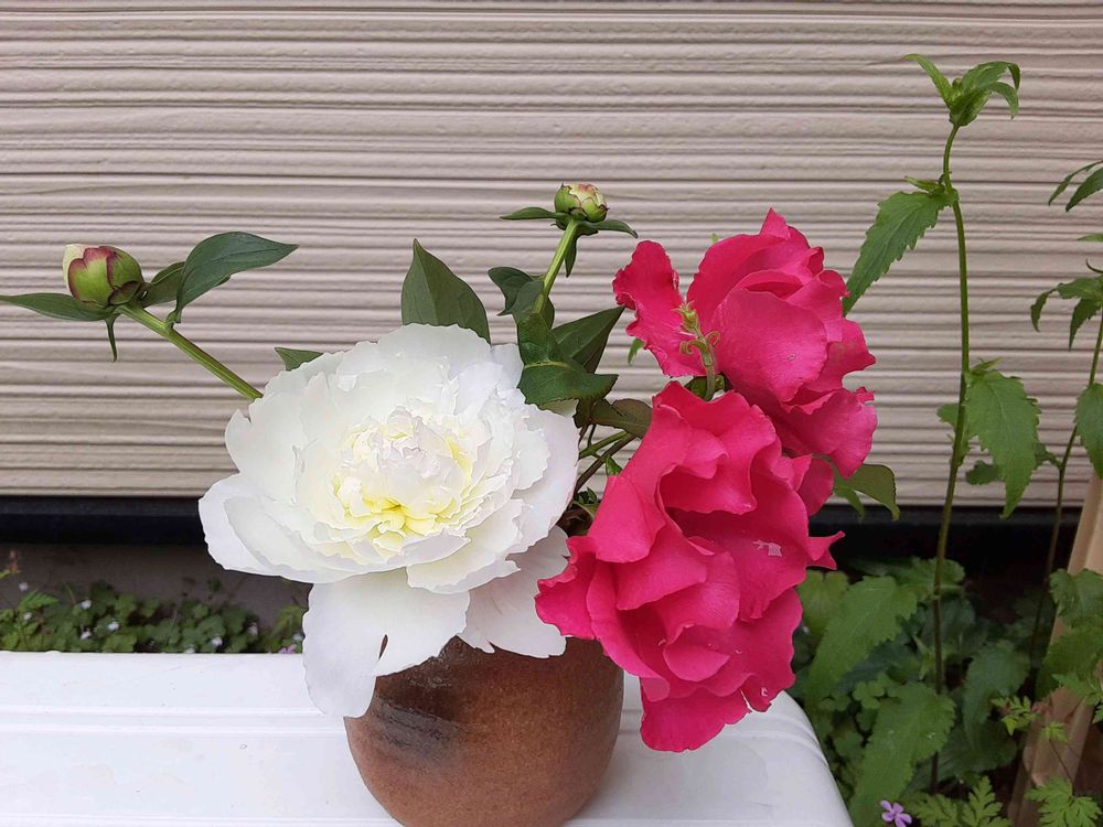 シヤクヤクと薔薇の赤白花合戦‼️ですね💕🌹🩷