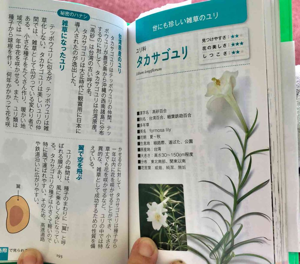 さん大阪の近くの神戸に咲いてる💗という事は 探せば 近くにもあるかも❣️ユリは球根だと思ってましたが 雑草手帳に翼で空を飛ぶ種と知り 興味を持ちました 雑草だからこそ可愛いのに さらに美しい❣️タカサゴユリ 大阪でも咲いてるかなぁ😊