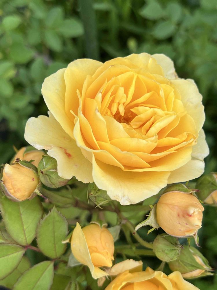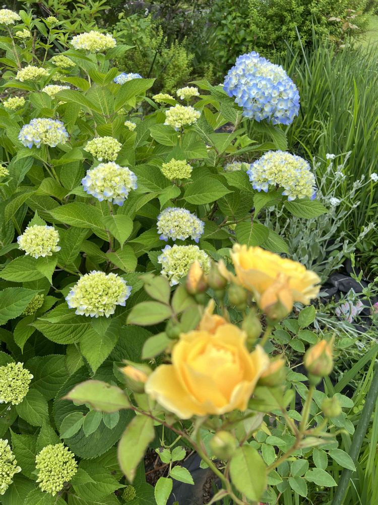 緑の中に黄色薔薇🟡青い紫陽花 なんとも元気の出る コラボですね🎶🎶🎶💘