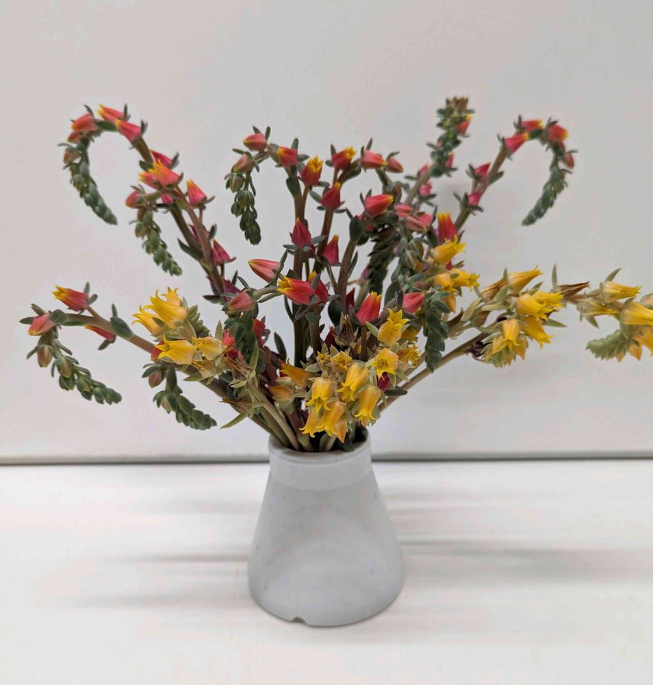 長〜い花芽なので飾ってみたけど、なんか仏壇のお供えみたいに見えるね。