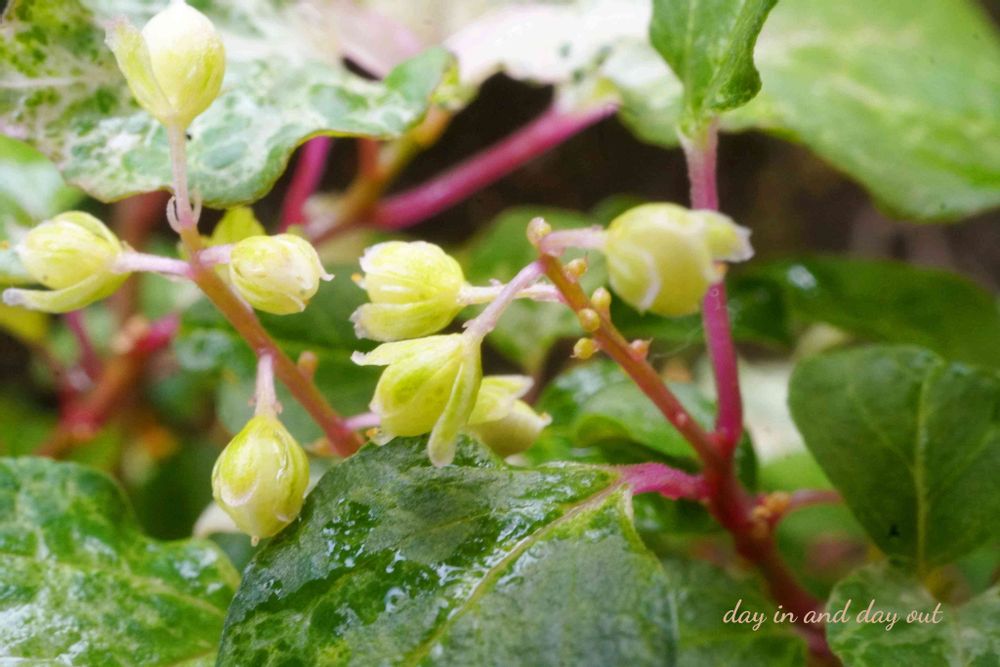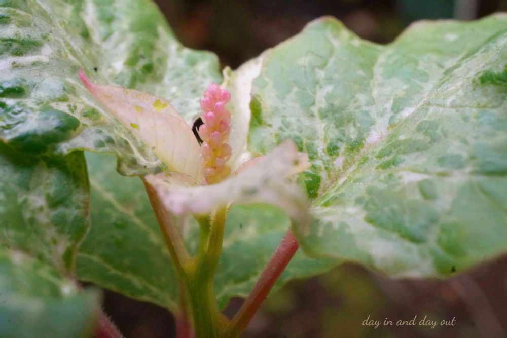 斑入りの葉の新芽も花芽もうっすらピンクで可愛らしいですෆ ̖́-